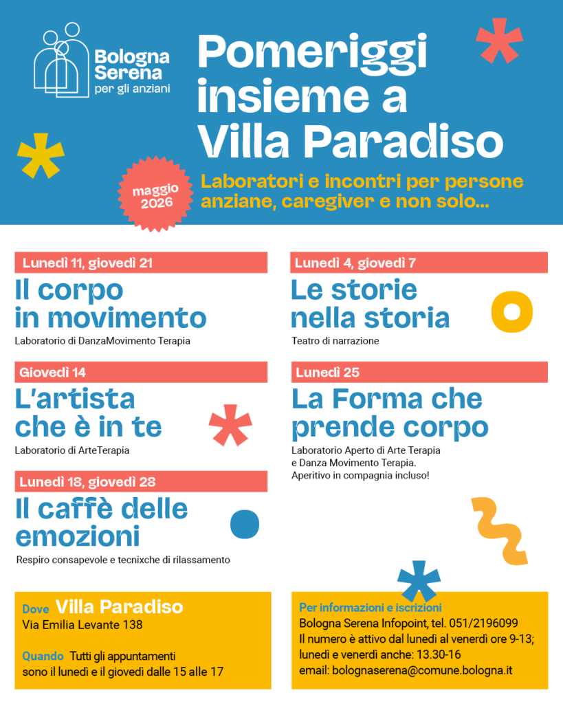 Cadiai propone per il mese di maggio un nuovo ciclo di appuntamenti di “Pomeriggi insieme a Villa Paradiso”, un calendario di laboratori e incontri rivolti a persone anziane, caregiver e a tutta la cittadinanza interessata a vivere esperienze di socialità, benessere e partecipazione attiva.