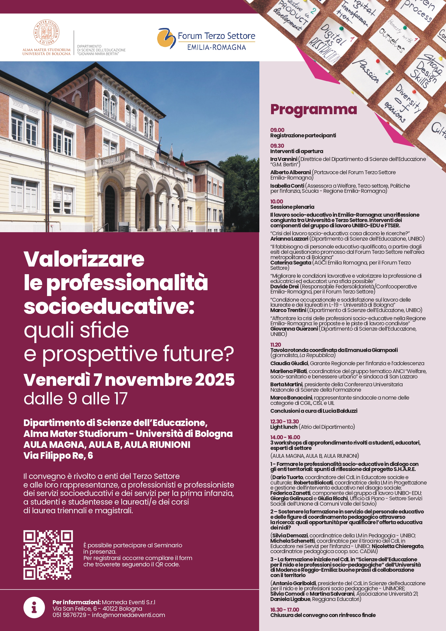 Venerdì 7 novembre 2025, presso l’Università di Bologna – Dipartimento di Scienze dell’Educazione “Giovanni Maria Bertin”, si terrà il Forum del Terzo Settore “Valorizzare le professionalità socio-educative”, promosso dal Forum del Terzo Settore Emilia-Romagna in collaborazione con Confcooperative, il mondo accademico e le istituzioni regionali.