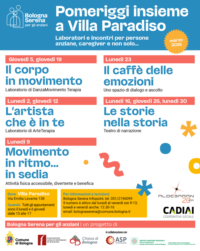 L’iniziativa è curata dalla Cooperativa Cadiai nell’ambito del progetto Bologna Serena del Comune di Bologna, realizzato in collaborazione con Fondazione Cassa di risparmio di Bologna, Chiesa di Bologna e Asp città di Bologna.