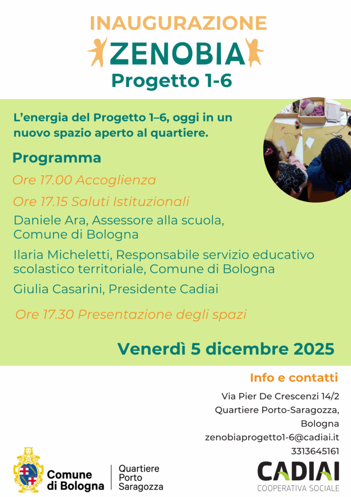 Il 27 novembre ha riaperto a Bologna lo Spazio educativo Zenobia, in via Gorki 6, nel Quartiere Navile. A breve, il 5 dicembre, sarà inaugurata una seconda sede in via Pier De Crescenzi 14/2, Zenobia Progetto 1-6 nel Quartiere Porto–Saragozza. La prosecuzione e l’ampliamento del progetto sono resi possibili dal sostegno del Comune di Bologna.